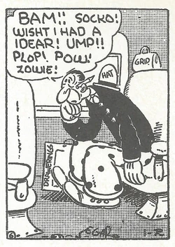 Bullony was created by E. C. Segar for the 1933 Thimble Theatre storyline "Puddleburg, the Laziest Town in the World". In said strip, he was hired by Popeye to work on his newly-acquired newspaper business.
