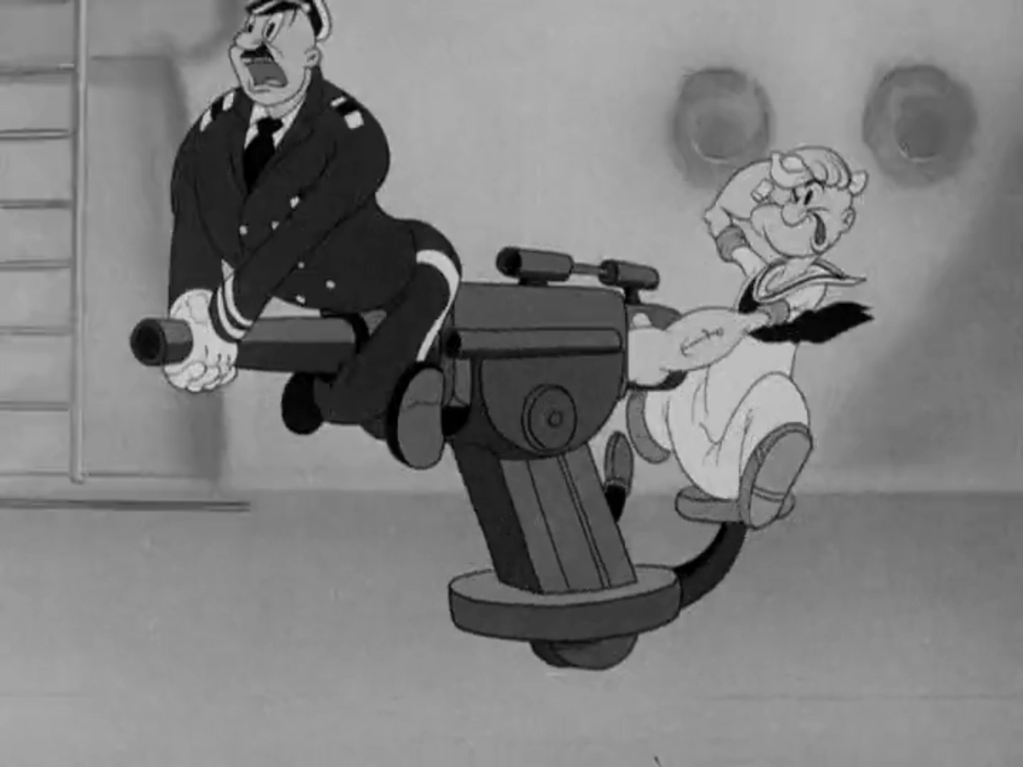 Navy sailor Popeye is on a battleship. He is in class to learn artillery, but it is way too technical for him; when he gets his hands on the gun, he fires everywhere, including at his own ship. That gets him banished to the boiler room. A real Japanese submarine comes along and the other sailors cannot handle it, so Popeye eats his spinach and dives in to fight the submarine by hand.