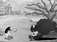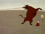 A prize bull attacked Swee'Pea after the baby entered its pen. Popeye stopped the bull by holding on the rope that held its nose ring. The beast retaliated, but its efforts were in vain as Popeye defeated it with one punch that sent it flying in the form of steaks on the fence of its pen.
