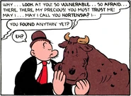 In the comics, J. Wellington Wimpy's obsession with hamburgers would often result in his stalking a cow, even on occasion attempting to perform its slaughter by strangling it with his bare hands. In certain cases, such as with Hortensia, he becomes attached to the animal, as some sort of "pet" with added appeal. Wimpy is not averse to the meat of male bulls, however. In a storyline by Tom Sims and Bela Zaboly, he disposed of the remains of a prize bull that had been unintentionally killed by Lummox.