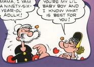 - A Popeye's Cartoon Club strip by Randy Milholland revealed that Popeye's unusual facial shape is passed down from parent to child, while those who marry into the family morph into it afterwards. This explains how the sailor's mother and paternal grandmother ended up sharing the same look.