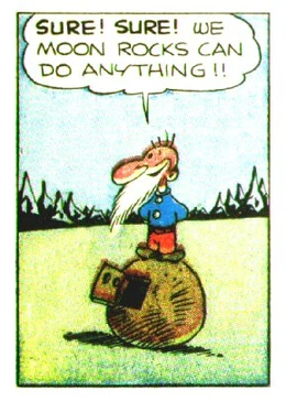 When Popeye and Wimpy landed on the Moon after volunteering to an independent space program, they were confronted by the Moon Rock Men who attempted to attack the Moon Goons. Luckily their efforts were stopped by Popeye. This however aroused their ire and they summoned the mighty King Granite to destroy Popeye. King Granite and Popeye then had an epic battle that resulted in much destruction as King Granite could easily control his gravity at will, but in the end, Popeye's endurance proved far more formidable and he was able to K.O. the mighty lunar king. King Granite then honorably admitted defeat and surrendered his crown and position to Popeye and under Popeye's rule, the Moon Rock Men and the Moon Goons finally made peace and prospered. However, Popeye and Wimpy eventually grew homesick but both knew they could not return as their ship was out of fuel. Luckily, Joe Granite offered Popeye and Wimpy two of his Moon Rock vessels to take them home and in return Popeye returned the crown and status of king to Joe much to his delight. The Moon Rock Men, their king and the Moon Goons then bid farewell to their Earthling friends.