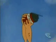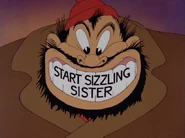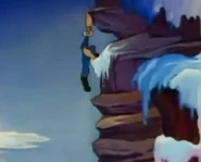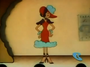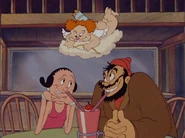 At this point, a polar bear-like creature enters the hostel and shakes off the snow it is covered in to reveal the dreaded Dangerous Dan McBluto. All other patrons run away as he strolls in, singing. He invites the dancing lady to share a milkshake and she accepts. At first, they are both struck by Cupid, but Popeye intervenes and ends up sucked into McBluto's mouth by mistake. The would-be Klondike Casanova locates Olive again, this time snatching her away more rudely with obviously lecherous intentions. She tries to excuse herself, only to be choked by the much larger man. When her sailor paramour tries to save her, he is sent flying to the frozen waters outside to be encased in ice, leaving McBluto to tie the damsel up into a parcel and carry her away through the frozen wasteland.
