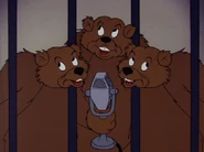 Popeye is able to use his pipe as a blowtorch to escape his imprisonment, proceeding to chase the kidnapper up the steep mountainside topped by 'Dan McBluto's Fur Farm'. Olive meets face-to-face with three vicious, imprisoned bears (that briefly interrupt their snarling to do a spirited imitation of the Andrews Sisters) as Popeye is made to fall off the peak he was about to conquer. Thanks to the power of spinach, however, his fall is broken and his pipe turned into a propeller. Atop the mountain, he easily defeats the bears McBluto has now let out, depriving them of their fur coats - which are welcomed to cover the scantily-clad Olive. She and Popeye wear these as they ride their new sleigh back home, with the only beast pulling it, Dangerous Dan McBluto, being whipped vigorously.
