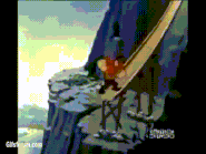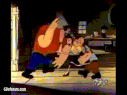 Olive, meanwhile, is flung onto a log flume while the two men battle it out. We are shown the death-dealing circular saw blade that awaits her at the end of her descent. But despite the grave and imminent threat to Olive, the men continue to joust over just who is to have the privilege of effecting a rescue. Bluto uses his immense strength to employ a tree trunk as a sledgehammer and pounds Popeye's body right through the deck of the flume. In a scene lifted almost verbatim from the roller-coaster entrapment sequence in King of the Mardi Gras, Popeye manages to devour his spinach, and then dispatches Bluto and snatches Olive from the jaws of death in the nick of time.