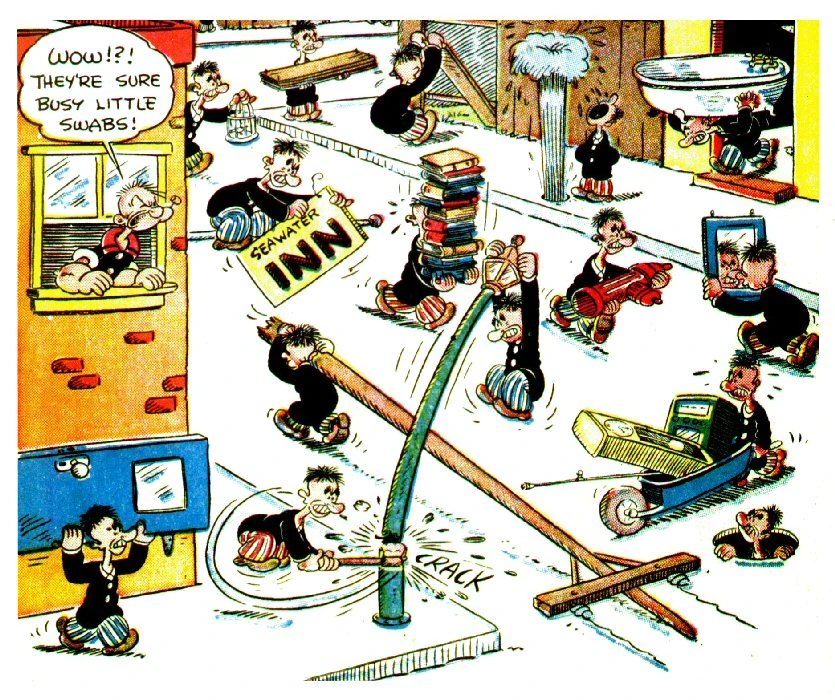Popeye refuses to hide from anything, so the manager tells him to look out the window and see the danger for himself. He pokes his head out the window to see a horde of little men ransacking the town of everything in sight. The manager explains the Misermites are a race of thieves from a neighboring island and they plunder the town every six months. Whenever they attack, everyone in town hides in their cellars until they leave. At that moment, the thieves enter the room and take everything they can get their hands on, even Swee'Pea.