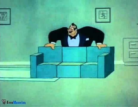 The doorbell rings and when Olive opens it, she is over the moon. There stands Bluto disguised as the International. The big man, who accidentally left his regular hat inside his top hat, proceeds to flirt with the enthralled brunette, who promptly lets him in. Bluto kisses Olive on the hand, causing her hair to stand up and her eyes to turn into hearts. Popeye kisses her on her other hand but only elicits an icy reaction. Bluto sets up a seat for himself and Olive and knocks Popeye out of the way. Popeye pulls the rug under Bluto and demands Olive forget the International and have a date with him, but she will not listen. Bluto uses a knife to cut Popeye's chair, causing him to spring him into the ceiling, and proceeds to dance with Olive. Popeye switches Bluto's dance partner with a broom to try and get Olive back, but she is not very interested in dancing with the sailor. Now Bluto does the switch with a mannequin, and walks off with the girl, but Popeye stops them.