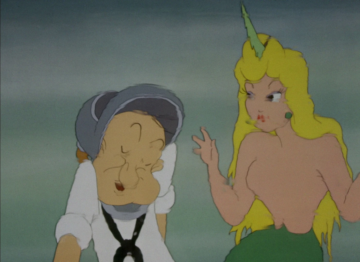 Aboard the "Olive Oyl's Salvage Co." ship, in a opening that recalls that of Stealin Aint Honest (1940), Olive shows Popeye a secret map indicating the resting place of a ship whose strong room contains a safe holding valuable treasure. Outside, on deck, stowaway Bluto eavesdrops. Upon arriving at the X-spot, Olive helps Popeye put on his diving helmet while Bluto dons his and beats Popeye to the marine bottom. There, Bluto notices a huge shark-eating clam and sets Popeye up to fall into its maw. Although undisturbed, the big man struggles to open the strong room's door, as his sailor competitor's pipe smoking frees him from his shellfish entrapment. Bluto then gets the idea to create a false "mermaid" by trapping a sawfish into the upper half of a broken mannequin. The manufactured sea maiden's undulating movements entrance the sailor so he keeps on chasing "her" and kissing "her."