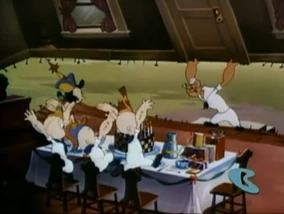 Later, the boys set up a fake door and a "Welcome" mat to trick Popeye, and he gets punched by a spring-loaded boxing glove. He then tries to go down the chimney, but the nephews set off a big rocket. Ultimately, he ends up getting washed through a washboard and hanged up to dry with his spinach, so he wrings spinach into his mouth to gain extra strength. He proceeds to lift up the house, but then finds a surprise birthday party prepared for him, much to his amusement.