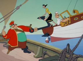 While sailing, Popeye and Olive come across a mysteriously-appearing, old-fashioned pirate ship. Aboard it, the crew sing about rum, with the smallest crewmember snatching some liquor away from his captain. When she hails the pirates, both Olive and Popeye are captured. Captain Pierre attempts to woo the slender lady by sweet-talking her and offering her a whole cargo of stolen jewels. Popeye's attempts to fight for his 'goil' prove unsuccessful and he is made to walk the plank - but he manages not to fall overboard. When he returns in disguise as an elegantly-dressed woman, Pierre becomes much more attracted to the large-limbed lady and tosses Olive aside. Yet Popeye's ruse is discovered and further struggles end with the sailor hero thrown towards the bottom of the ocean and Davy Jones' locker, chained, with Olive suffering the big pirate's persecution. By chance, a small sawfish swims near Popeye reading an issue of Popeye Comics, recognizes the hero and his predicament, and helpfully rips the spinach can from the comic's cover, sawing it open in order to feed Popeye. Energized, the latter gets back up on deck, defeats Pierre in a swordfight (employing a pocket knife) then uses him as a spinning top to beat the other pirates. As Popeye and Olive are about to celebrate with a kiss, they are interrupted by the smallest pirate coming between them.