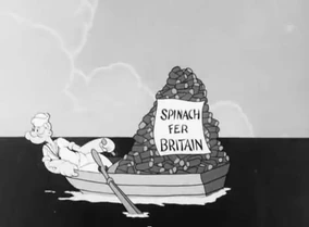 Meanwhile, Popeye the Sailor is heading for Britain with a shipment of spinach to donate as a war ration; his ship is attacked and sunk by the Nazi patrol before he can reach Britain. Popeye manages to escape with his spinach in a rowboat but is pursued by the Nazis. Popeye flips the U-boat upside-down and quickly withdraws.