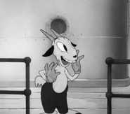 The goat desists of his suicide attempt and runs to board the appetizing all-metal ship, where Popeye, as a Navy sailor, is carrying out his duties. Bent on eating all metallic implements, the animal starts with a bucket, leaving only its watery contents on the angered sailor's hands. When the latter gives chase, he falls into a trap that the goat had prepared beforehand. The animal further eats a chain, shells and other utensils, until Popeye tries to hammer him, but the intruder ingratiates himself with the nearby Admiral Kurry just in time, introducing himself as "Billy the Kid". The Admiral instructs Popeye not to harm the animal but then leaves on a taxi to go to the movies.