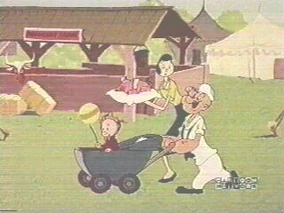 Popeye pushes Swee'Pea's carriage as he accompanies Olive Oyl to a large county fair, where she is taking her prize piglet Smedley to a pig show. Meanwhile, Popeye is left to amuse Swee'Pea with the fair's various attractions. Both the sailor and the baby are entertained by Jojo, the India Rubber Man's stretchy body, and Swee'Pea is inspired to play with his balloon in the same way; however, this causes it to float off and the baby leaves his carriage in order to chase it - without Popeye noticing. When he does, Swee'Pea is already midway through an archery shooting range, although Popeye is the only one to end up caught by the arrows. After Swee'Pea is almost hit by a hammer at the test-of-strength pole, Popeye is not so lucky. Next up is the pen of a prize bull, which Swee'Pea enters, with his red gown causing the animal to go berserk, yet Popeye takes care of the beast in the nick of time. The baby then walks through a "win a doll" booth, and the doll-to-be-hit-by-baseballs' resemblance to Swee'Pea only adds to Popeye's worries.