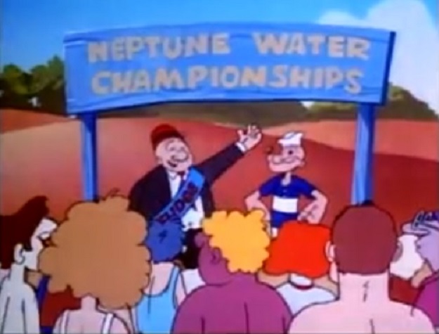 The Neptune Water Championship is about to start so Judge Olive Oyl and Head Judge Wimpy greet the crowd. The competitors are getting ready on the beach as Popeye drives up with his surfboard on top of his van. He has trouble getting his board down because he forgets to untie it first, so he carries the whole van to the beach with it. Popeye's clumsy streak continues as he knocks down a row of surfboards and Olive at the end of the row. This does not make Olive happy.